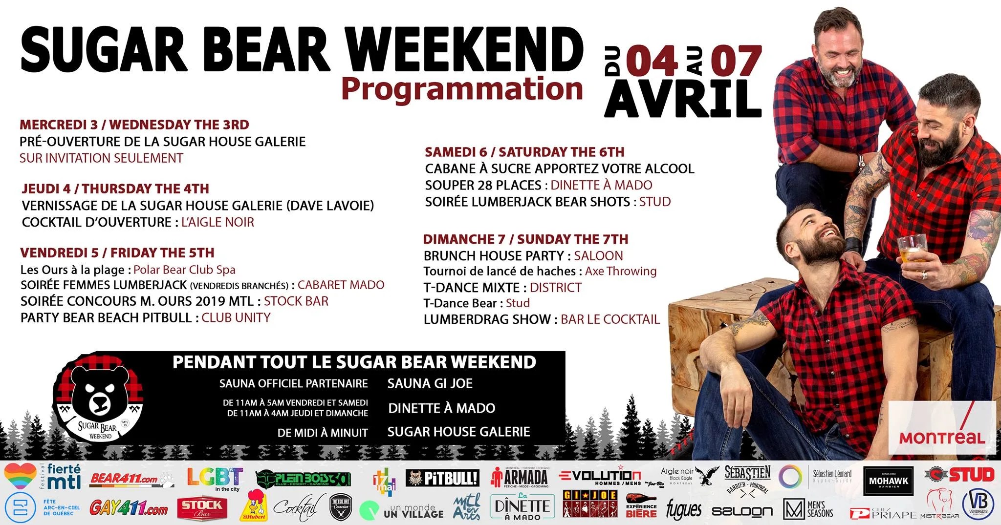 Allez les boys on sort de la ville en autobus pour aller à la cabane à sucre et rencontrer des beaux bears du « Sugar Bear Weekend ». Le tout sera sous formule buffet à volonté, apportez votre alcool, DJ avec musique style « Happy Hour » et tout ça pour 59$ plus frais Evenbrite.